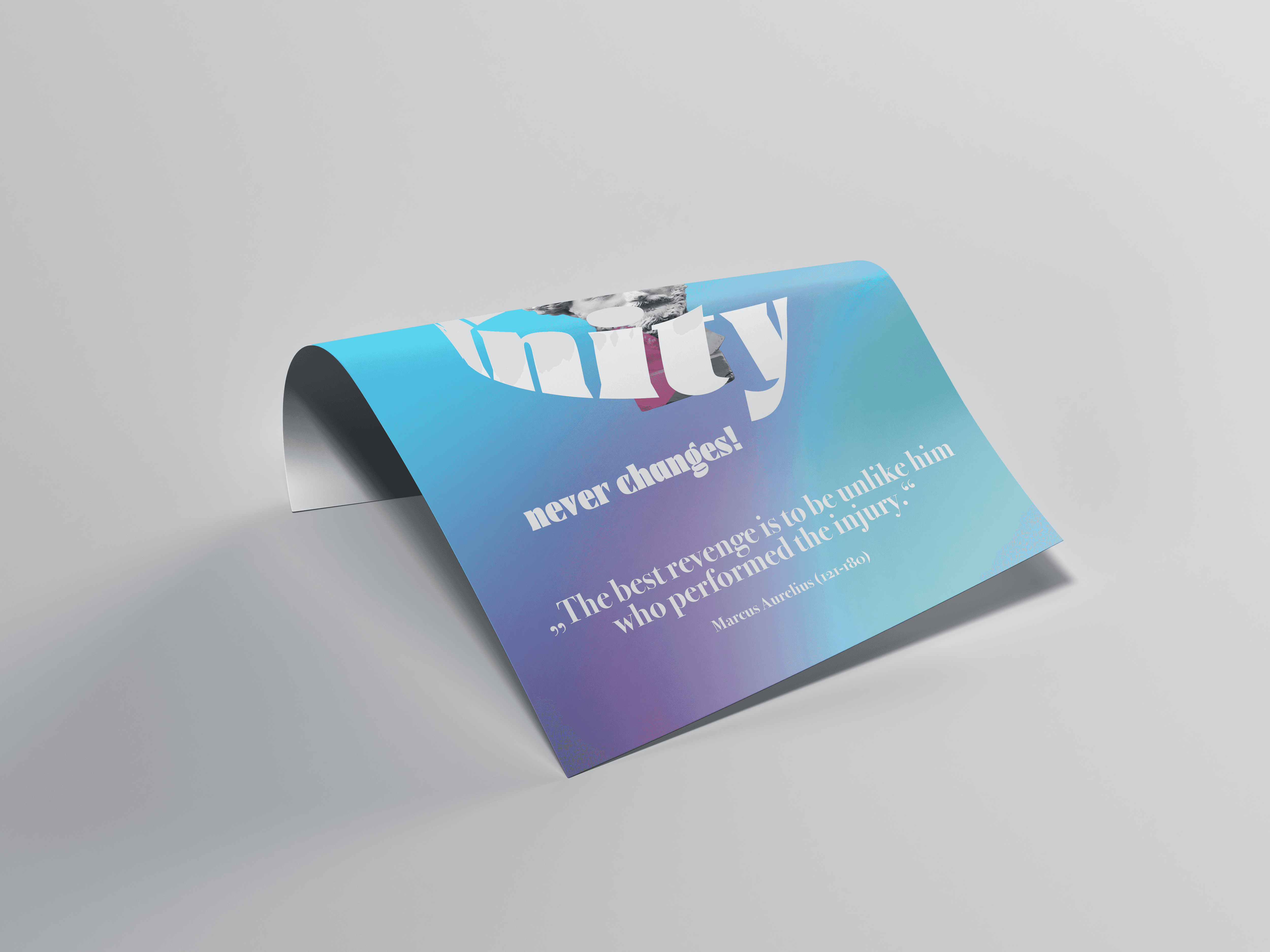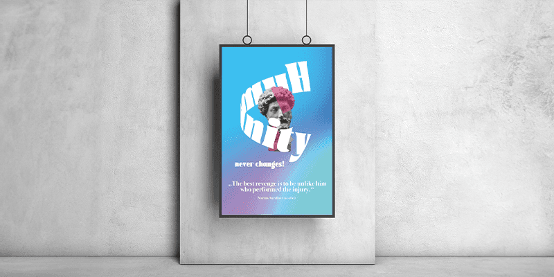 Das Plakat zeigt eine Büste des römischen Kaisers und Philosophen Marcus Aurelius, dessen Selbstbetrachtungen bereits in der Antike Fragen nach menschlichem Handeln und Moral in Kriegszeiten thematisierten. Die Büste wird typografisch von dem Wort „humanity“ umschlungen und durch den Claim „never changes!“ ergänzt, um zu verdeutlichen, dass wahre Menschlichkeit zeitunabhängig ist. Im unteren Bereich steht das Zitat „The best revenge is to be unlike him who performed the injury.“, das Marcus Aurelius in Kriegszeiten formulierte und im Kontext heutiger Konflikte als Erinnerung verstanden werden soll, dass Rache nach einem Krieg selten zu Heilung oder Frieden führt und dass Menschlichkeit langfristig immer auf Ausgleich und friedliche Lösungen zielt – ohne dabei das Recht auf Selbstverteidigung in Frage zu stellen.