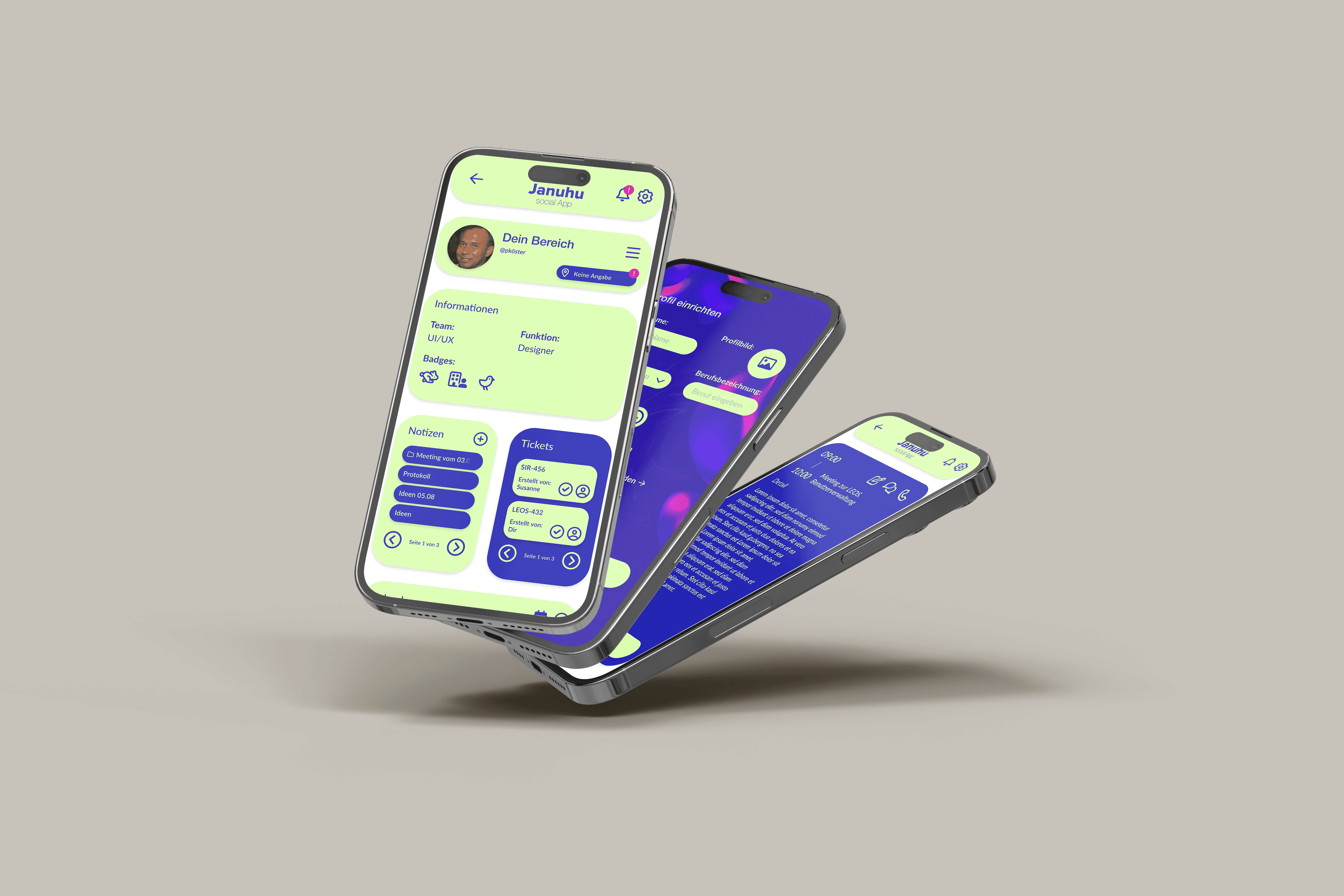 Die Lösung ist die Konzeption von „Januhu“, einer social Intranet-App, die Fun- und Work-Bereiche in einer gemeinsamen Umgebung vereint und damit Gamification gezielt in den Unternehmenskontext überträgt. Kern der App ist eine visuell stark gedachte Hauptnavigation: Mitarbeitende bewegen sich durch ein virtuelles Büro mit Karten- und Listenansicht, wechseln per Swipe zwischen Fun und Work und entdecken dort Räume, Posts, Aufgaben, Chats, Voice-Channels und Events. Gleichzeitig bündelt Januhu Funktionen wie Zeiterfassung, Urlaubsplanung, Tickets und To-dos in einem übersichtlichen Interface, ergänzt um Profil- und Gruppenräume, die soziale Interaktion, Kennenlernen und Teamarbeit spielerisch anregen. Januhu ist eine Wort Zusammensetzung aus den Worten Janus und der Grußformel Huhu. Janus ist ein Römischer Gott er hat zwei Köpfe und steht für Gegensätze verbunden in einem genau wie die App es widerspiegelt.