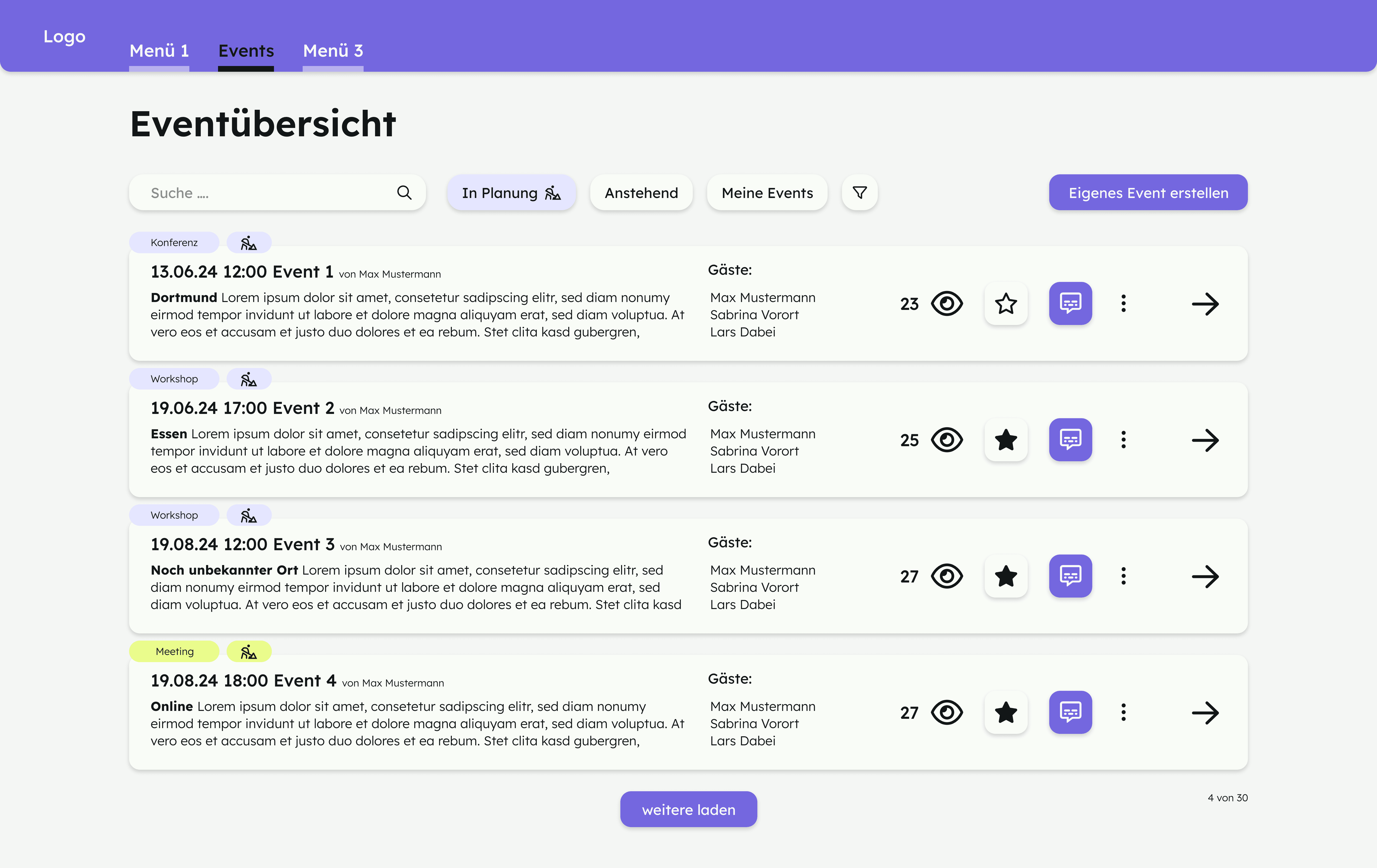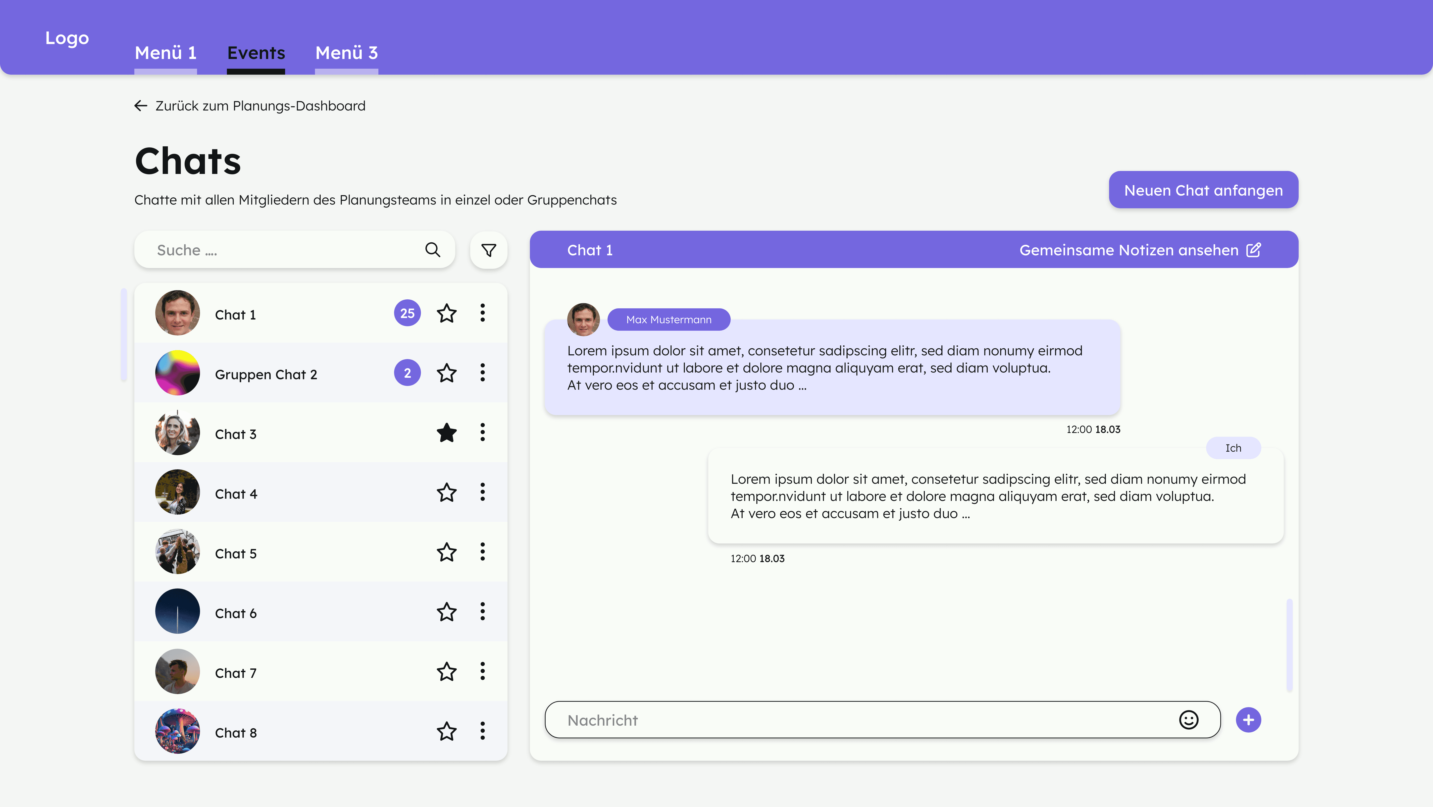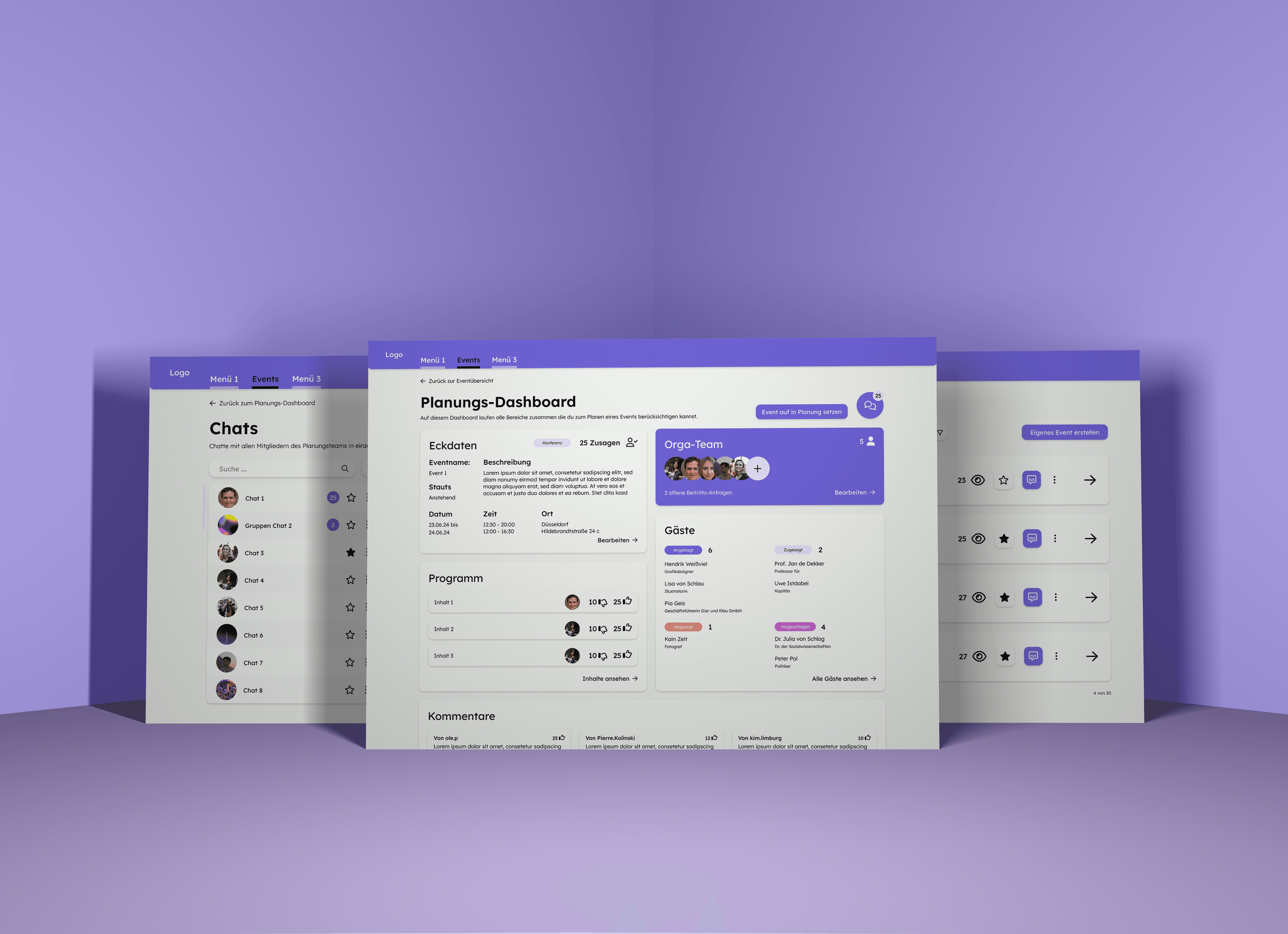 Das UI-Projekt sollte es dem Benutzer ermöglichen, einfach und unkompliziert Veranstaltungen zu planen. Die Herausforderung für den Benutzer besteht darin, interessante und aktuelle Themen zu finden und nicht nur von seiner eigenen Bubble beeinflusst zu werden. Dementsprechend soll er auch interessante Gäste und Referenten finden und einladen können.